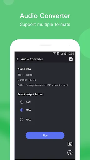 Music Editor allows users to convert many different audio formats without many complicated operations. The application supports many popular audio formats (AAC, MP3, M4A, and WAV), so users can convert any audio file to the desired format; for example, convert AAC to MP3, then continue to convert MP3 to WAV.